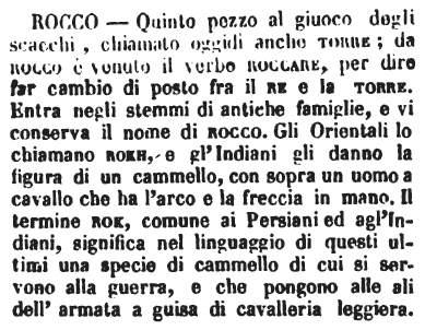 | Rocco - Quinto pezzo al giuoco degli scacchi, chiamato oggidì anche torre; da rocco è venuto il verbo roccare, per dire far cambio di posto fra il re e la torre. Entra negli stemmi di antiche famiglie, e vi conserva il nome di rocco. Gli Orientali lo chiamano rokh, e gl'Indiani gli danno la figura di un cammello, con sopra un uomo a cavallo che ha l'arco e la freccia in mano. Il termine rok, comune ai Persiani ed agl'Indiani, significa nel linguaggio di questi ultimi una specie di cammello di cui si servono alla guerra, e pongono alle ali dell'armata a guisa di cavalleria leggiera. [immagine] |