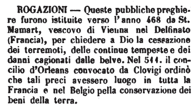 | Rogazioni - Queste pubbliche preghiere furono istituite verso l'anno 468 da St. Mamart, vescovo di Vienna nel Delfinato (Francia), per chiedere a Dio la cessazione dei terremoti, delle continue tempeste e dei danni cagionati dalle belve. Nel 511. il concilio d'Orleans convocato da Clovigi ordinò che tali preci avessero luogo in tutta la Francia e nel Belgio pella conservazione dei beni della terra. [immagine] |