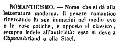 | Romanticismo - Nome che si dà alla letteratura moderna. Il genere romantico ricercando le sue immagini nel medio evo e le cose gotiche, è opposto al classico, sempre fedele all'antichità: esso si deve a Chateaubriand e alla Staël. [immagine] |