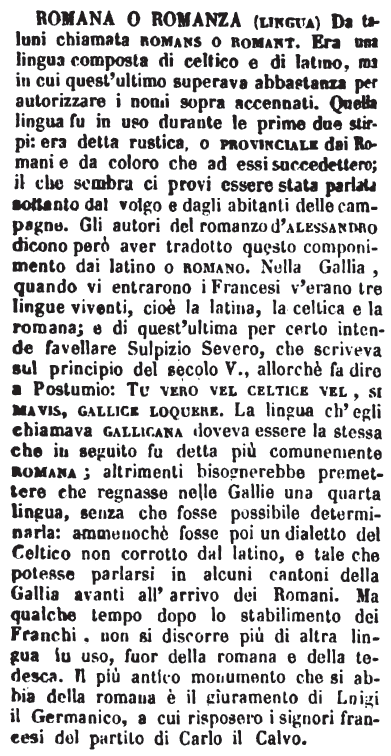 | Romana o Romanza (lingua) - Da taluni chiamata romans o romant. Era una lingua composta di celtico e di latino, ma in cui quest'ultimo superava abbastanza per autorizzare i nomi sopra accennati. Quella lingua fu in uso durante le prime due stirpi: era detta rustica, o provinciale dai Romani e da coloro che ad essi succedettero; il che sembra ci provi essere stata parlata soltanto dal volgo e dagli abitanti delle campagne. Gli autori del romanzo d'alessandro dicono però aver tradotto questo componimento dal latino o romano. Nella Gallia, quando vi entrarono i Francesi v'erano tre lingue viventi, cioè la latina, la celtica e la romana; e di quest'ultima per certo intende favellare Sulpizio Severo, che scriveva sul principio del secolo V., allorchè fa dire a Postumio: Tu vero vel celtice vel, si mavis, gallice loquere. La lingua ch'egli chiamava gallicana doveva essere la stessa che in seguito fu detta più comunemente romana; altrimenti bisognerebbe premettere che regnasse nelle Gallie una quarta lingua, senza che fosse possibile determinarla: ammenochè fosse poi un dialetto del Celtico non corrotto dal latino, e tale che potesse parlarsi in alcuni cantoni della Gallia avanti all'arrivo dei Romani. Ma qualche tempo dopo lo stabilimento dei Franchi, non si discorre più di altra lingua in uso, fuor della romana e della tedesca. Il più antico monumento che si abbia della romana è il giuramento di Luigi il Germanico, a cui risposero i signori francesi del partito di Carlo il Calvo. [immagine] |