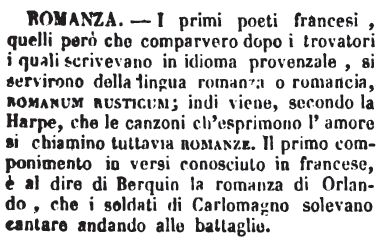 | Romanza - I primi poeti francesi, quelli però che comparvero dopo i trovatori i quali scrivevano in idioma provenzale, si servirono della lingua romanza o romancia, romanum rusticum; indi viene, secondo la Harpe, che le canzoni ch'esprimono l'amore si chiamino tuttavia romanze. Il primo componimento in versi conosciuto in francese, è al dire di Berquin la romanza di Orlando, che i soldati di Carlomagno solevano cantare andando alle battaglie. [immagine] |