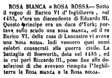 | Rosa bianca, Rosa rossa - Sotto il regno di Enrico VI d'Inghilterra, nel 1453, v'era un discendente di Eduardo III. Questo principe era un duca d'York; partava sullo scudo una rosa bianca, ed il re Enrico VI. della casa di Lancastre vi aveva una rosa rossa. Indi vennero quei nomi celebri consacrati alla guerra civile. La battaglia di Bosworth, data del 1485, ed in cui perì Riccardo III., pose fine alle desolazioni di che avevano riempita l'Inghilterra la Rosa bianca e la Rosa rossa. [immagine] |
