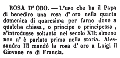 | Rosa d’oro - L'uso che ha il Papa di benedire una rosa d'oro nella quarta domenica di quaresima per farne dono a qualche chiesa, o principe o principessa, s'introdusse soltanto nel secolo XII; almeno non n'è parlato prima nella storia. Alessandro III mandò la rosa d'oro a Luigi il Giovane re di Francia. [immagine] |