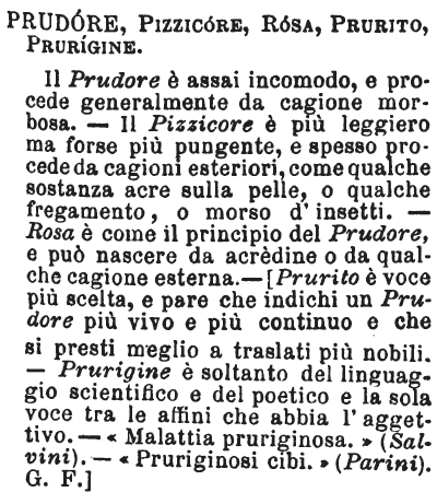 | Prudore, Pizzicore, Rosa, Prurito, Prurigine - Il Prudore è assai incomodo, e procede generalmente da cagione morbosa. - Il Pizzicore è più leggiero ma forse più pungente, e spesso procede da cagioni esteriori, come qualche sostanza acre sulla pelle, o qualche fregamento, o morso d'insetti. - Rosa è come il principio del Prudore, e può nascere da acrèdine o da qualche cagione esterna. - [Prurito è voce più scelta, e pare che indichi un Prudore più vivo e più continuo e che si presti meglio a traslati più nobili. - Prurigine è soltanto del linguaggio scientifico e del poetico e la sola voce tra le affini che abbia l'aggettivo. - «Malattia pruriginosa.» (Salvini). - «Pruriginosi cibi.» (Parini). G. F.] [immagine] |