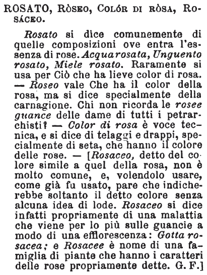| Rosato, Roseo, Color di rosa, Rosaceo - Rosato si dice comunemente di quelle composizioni ove entra l'essenza di rose. Acqua rosata, Unguento rosato, Miele rosato. Raramente si usa per Ciò che ha lieve color di rosa. - Roseo vale Che ha il color della rosa, ma si dice specialmente della carnagione. Chi non ricorda le rosee guance delle dame di tutti i petrarchisti? - Color di rosa è voce tecnica, e si dice di telaggi e drappi, specialmente di seta, che hanno il colore delle rose. - [Rosaceo, detto del colore simile a quel della rosa, non è molto comune, e, volendolo usare, come già fu usato, pare che indicherebbe soltanto il detto colore senza alcuna idea di lode. Rosaceo si dice infatti propriamente di una malattia che viene per lo più sulle guancie a modo di una efflorescenza: Gotta rosacea; e Rosacee è nome di una famiglia di piante che hanno i caratteri delle rose propriamente dette. G. F.] [immagine] |