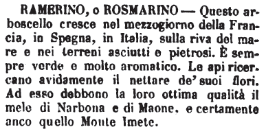 | Ramerino, o Rosmarino - Questo arboscello cresce nel mezzogiorno della Francia, in Spagna, in Italia, sulla riva del mare e nei terreni asciutti e pietrosi. E' sempre verde e molto aromatico. Le api ricercano avidamente il nettare de' suoi flori. Ad esso debbono la loro ottima qualità il mele di Narbona e di Maone, e certamente anco quello Monte Imete. [immagine] |