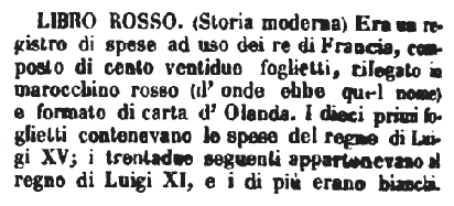 | Libro rosso (Storia moderna) - Era un registro di spese ad uso dei re di Francia, composto di cento ventidue foglietti, rilegato in marocchino rosso (d'onde ebbe quel nome) e formato di carta d'Olanda. I dieci primi foglietti contenevano le spese del regno di Luigi XV; i trentadue seguenti appartenevano al regno di Luigi XI, e i di più erano bianchi. [immagine] |