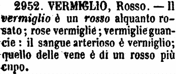 | Vermiglio, Rosso - Il vermiglio è un rosso alquanto rosato; rose vermiglie; vermiglie guancie: il sangue arterioso è vermiglio; quello delle vene è di un rosso più cupo. [immagine] |