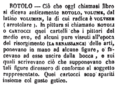 | Rotolo - Ciò che oggi chiamasi libro si diceva anticamente rotolo, volume, dal latino volumen, la di cui radica è volvere (arrotolare). In pittura si chiamano rotoli o cartocci quei cartelli che i pittori del medio evo, ed alcuni pure vissuti all'epoca del risorgimento (la renaissance) delle arti, ponevano in mano ad alcune figure, o facevano ad esse uscire dalla bocca, e sui quali scrivevano ciò che supponevano che tali figure dicessero di conforme al soggetto rappresentato. Quei cartocci sono spariti insieme col gusto gotico. [immagine] |