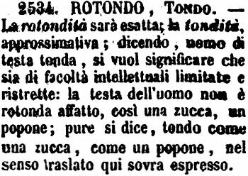 | Rotondo, Tondo - La rotondità sarà esatta; la tondità, approssimativa; dicendo, uomo di testa tonda, si vuol significare che sia di facoltà intellettuali limitate e ristrette: la testa dell'uomo non è rotonda affatto, così una zucca, un popone; pure si dice, tondo come una zucca, come un popone, nel senso traslato qui sovra espresso. [immagine] |
