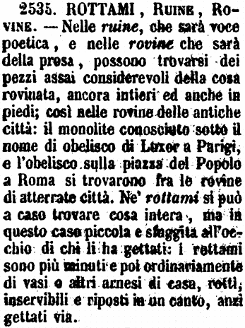 | Rottami, Ruine, Rovine - Nelle ruine, che sarà voce poetica, e nelle rovine che sarà della prosa, possono trovarsi dei pezzi assai considerevoli della cosa rovinata, ancora intieri ed anche in piedi; così nelle rovine delle antiche città: il monolite conosciuto sotto il nome di obelisco di Luxor a Parigi, e l'obelisco sulla piazza del Popolo a Roma si trovarono fra le rovine di atterrate città. Ne' rottami si può a caso trovare cosa intera, ma in questo caso piccola e sfuggita all'occhio di chi li ha gettati: i rottami sono più minuti e poi ordinariamente di vasi e altri arnesi di casa, rotti, inservibili e riposti in un canto, anzi gettati via. [immagine] |