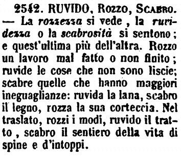| Ruvido, Rozzo, Scabro - La rozzezza si vede, la ruvidezza o la scabrosità si sentono; e quest'ultima più dell'altra. Rozzo un lavoro mal fatto o non finito; ruvide le cose che non sono liscie; scabre quelle che hanno maggiori ineguaglianze: ruvida la lana, scabro il legno, rozza la sua corteccia. Nel traslato, rozzi i modi, ruvido il tratto, scabro il sentiero della vita di spine e d'intoppi. [immagine] |