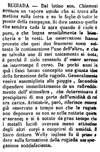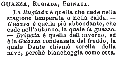 | Guazza, Rugiada, Brinata - La Rugiada è quella che cade nella stagione temperata o nella calda. - Guazza è quella più abbondante, che cade nell'autunno, la quale fa guazzo. - Brinata è quella dell'inverno, ed è la Guazza condensata dal freddo, la quale Dante chiamò sorella della neve, perchè biancheggia come essa. [immagine] |
