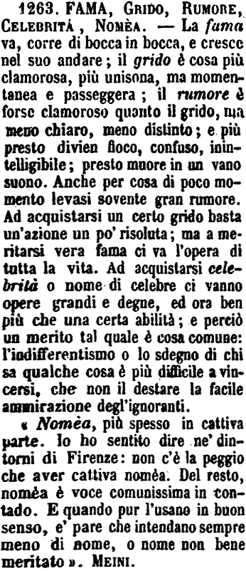 | Fama, Grido, Rumore, Celebrità, Nomèa - La fama va, corre di bocca in bocca, e cresce nel suo andare; il grido è cosa più clamorosa, più unisona, ma momentanea e passeggera; il rumore è forse clamoroso quanto il grido, ma meno chiaro, meno distinto; e più presto divien fioco, confuso, inintelligibile; presto muore in un vano suono. Anche per cosa di poco momento levasi sovente gran rumore. Ad acquistarsi un certo grido basta un'azione un po' risoluta; ma a meritarsi vera fama ci va l'opera di tutta la vita. Ad acquistarsi celebrità o nome celebre ci vanno opere grandi e degne, ed ora ben più che una certa abilità; e perciò un merito tal quale è cosa comune: l'indifferentismo o lo sdegno di chi sa qualche cosa è più difficile a vincersi, che non il destare la facile ammirazione degl'ignoranti.
