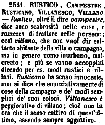 | Rustico, Campestre, Rusticano, Villanesco, Villano - Rustico, oltre il dire campestre, dice anco scabrosità nelle cose, e rozzezza di trattare nelle persone; così villano, che non vuol dir soltanto abitante della villa o campagna, ma in genere uomo inurbano, malcreato; e più se vanno accoppiati dicendo per es. modi rustici e villani. Rusticano ha senso innocente, non si dice che enunziativamente di cose della campagna e de' modi semplici de' suoi coloni. Villanesco è peggiorativo di villano; cioè non ha ora che il senso cattivo di quest'ultimo, essendo sempre aggettivo. [immagine] |