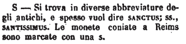 | S - Si trova in diverse abbreviature degli antichi, e spesso vuol dire sanctus; ss., santissimus. Le monete coniate a Reims sono marcate con una s. [immagine] |