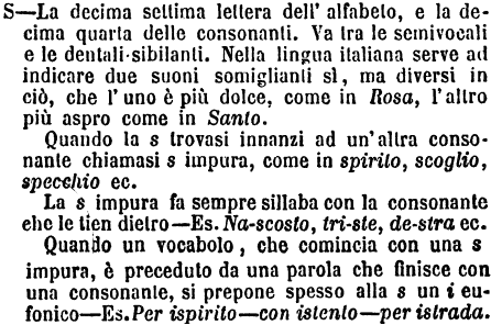 Quando la s trovasi innanzi ad un'altra consonante chiamasi s impura, come in spirito, scoglio, specchio ec. La s impura fa sempre sillaba con la consonante che le tien dietro - Es. Na-scosto, tri-ste, de-stra ec. Quando un vocabolo, che comincia con una s impura, è preceduto da una parola che finisce con una consonante, si prepone spesso alla s un i eufonico - Es. Per ispirito - con istento - per istrada. [immagine] |