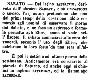 E' poi il settimo od ultimo giorno della settimana. Anticamente era consacrato al pianeta di Saturno, ed anche oggi si chiama in inglese saturday, ed in fiammingo laterdag. [immagine] |