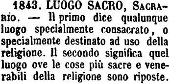 | Luogo sacro, Sacrario - Il primo dice qualunque luogo specialmente consacrato, o specialmente destinato ad uso della religione. Il secondo significa quel luogo ove le cose più sacre e venerabili della religione sono riposte. [immagine] |