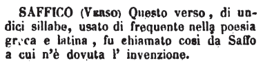 | Saffico (Verso) - Questo verso, di undici sillabe, usato di frequente nella poesia greca e latina, fu chiamato così da Saffo a cui n'è dovuta l'invenzione. [immagine] |