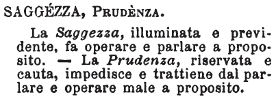 | Saggezza, Prudenza - La Saggezza, illuminata e previdente, fa operare e parlare a proposito. - La Prudenza, riservata e cauta, impedisce e trattiene dal parlare e operare male a proposito. [immagine] |