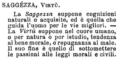 | Saggezza, Virtù - La Saggezza suppone cognizioni naturali o acquisite, ed è quella che guida l'uomo per le vie migliori. - La Virtù suppone nel cuore umano, o per natura o per istudio, tendenza al bene morale, e repugnanza al male. Il suo fine è quello di sottomettere le passioni alle leggi morali e civili. [immagine] |
