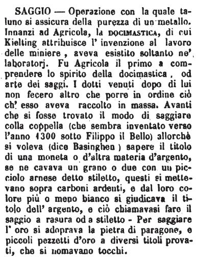 | Saggio - Operazione con la quale taluno si assicura della purezza di un metallo. Innanzi ad Agricola, la docimastica, di cui Kielting attribuisce l'invenzione al lavoro delle miniere, aveva esistito soltanto ne' laboratorj. Fu Agricola il primo a comprendere lo spirito della docimastica, od arte dei saggi. I dotti venuti dopo di lui non fecero altro che porre in ordine ciò ch'esso aveva raccolto in massa. Avanti che si fosse trovato il modo di saggiare colla coppella (che sembra inventato verso l'anno 1300 sotto Filippo il Bello) allorchè si voleva (dice Basinghen) sapere il titolo di una moneta o d'altra materia d'argento, se ne cavava un grano o due con un picciolo arnese detto stiletto, questi si mettevano sopra carboni ardenti, e dal loro colore più o meno bianco si giudicava il titolo dell'argento, e ciò chiamavasi fare il saggio a rasura od a stiletto - Per saggiare l'oro si adoprava la pietra di paragone, e piccoli pezzetti d'oro a diversi titoli provati, che si nomavano tocchi. [immagine] |