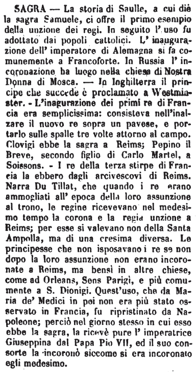 | Sagra - La storia di Saulle, a cui diè la sagra Samuele, ci offre il primo esempio della unzione dei regi. In seguito l'uso fu adottato dai popoli cattolici. L'inaugurazione dell'imperatore di Alemagna si fa comunemente a Francoforte. In Russia l'incoronazione ha luogo nella chiesa di Nostra Donna di Mosca. - In Inghilterra il principe che succede è proclamato a Westminster. - L'inaugurazione dei primi re di Francia era semplicissima: consisteva nell'inalzare il nuovo re sopra un pavese, e portarlo sulle spalle tre volte attorno al campo. Clovigi ebbe la sagra a Reims; Pepino il Breve, secondo figlio di Carlo Martel, a Soissons. - I re della terza stirpe di Francia la ebbero dagli arcivescovi di Reims. Narra Du Tillat, che quando i re erano ammogliati all'epoca della loro assunzione al trono, le regine ricevevano nel medesimo tempo la corona e la regia unzione a Reims; per esse si valevano non della Santa Ampolla, ma di una cresima diversa. Le principesse che non isposavano i re se non dopo la loro assunzione non erano incoronate a Reims, ma bensì in altre chiese, come ad Orleans, Sens Parigì, e più comunemente a S.Dionigi. Quest'uso, che da Maria de' Medici in poi non era più stato osservato in Francia, fu ripristinato da Napoleone; perciò nel giorno stesso in cui esso ebbe la sagra, la ricevè pure l'imperatrice Giuseppina dal Papa Pio VII, ed il suo consorte la incoronò siccome si era incoronato egli medesimo. [immagine] |