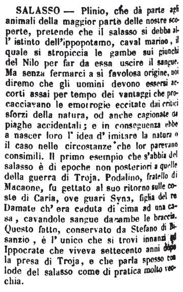 | Salasso - Plinio, che dà parte agli animali della maggior parte delle nostre scoperte, pretende che il salasso si debba all’istinto dell’ippopotamo, caval marino, il quale si stropiccia le gambe sui giunchi del Nilo per far da essa uscire il sangue. Ma senza fermarci a sì favolosa origine, noi diremo che gli uomini devono essersi accorti assai per tempo dei vantaggi che procacciavano le emorrogie eccitate dai critici sforzi della natura, od anche cagionate da piaghe accidentali; e in conseguenza ebbe a nascer loro l’idea d’imitare la natura o il caso nelle circostanze che lor parevano consimili. Il primo esempio che s’abbia del salasso è di epoche non posteriori a quelle della guerra di Troja. Podalino, fratello di Macaone, fu gettato al suo ritorno sulle coste di Caria, ove guarì Syna, figlia del re Damate ch’era caduta di cima ad una casa, cavandole sangue da ambe le braccia. Questo fatto, conservato da Stefano di Bisanzio, è l’unico che si trovi innanzi ad Ippocrate che viveva settecento anni dopo la presa di Troja, e che parla spesso con lode del salasso come di pratica molto vecchia. [immagine] |