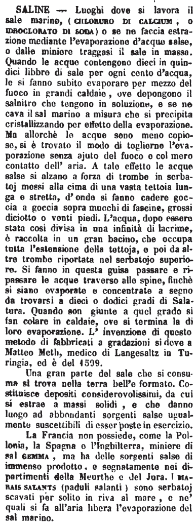 Saline - Luoghi dove si lavora il sale marino, (chloruro di calcium, o idroclorato di soda) o se ne faccia estrazione mediante l'evaporazione d'acque salse, o dalle miniere traggasi il sale in massa. Quando le acque contengono dieci in quindici libbre di sale per ogni cento d'acqua, le si fanno subito evaporare per mezzo del fuoco in grandi caldaie, ove depongono il salnitro che tengono in soluzione, e se ne cava il sal marino a misura che si precipita cristallizzando per effetto della evaporazione. Ma allorchè le acque sono meno copiose, si è trovato il modo di toglierne l'evaporazione senza ajuto del fuoco e col mero contatto dell'aria. A tale effetto le acque salse si alzano a forza di trombe in serbatoj messi alla cima di una vasta tettoia lunga e stretta, d'onde si fanno cadere goccia a goccia sopra mucchi di fascine, grossi diciotto o venti piedi. L'acqua, dopo essere stata così divisa in una infinità di lacrime, è raccolta in un gran bacino, che occupa tutta l'estensione della tettoja, e poi da altre trombe riportata nel serbatojo superiore. Si fanno in questa guisa passare e ripassare le acque traverso alle spine, finchè si siano evaporate e concentrate a segno da trovarsi a dieci o dodici gradi di Salatura. Quando son giunte a quel grado si fan colare in caldaie, ove si termina la di loro evaporazione. L'invenzione di questo metodo di fabbricati a gradazioni si deve a Matteo Meth, medico di Langesaltz in Turingia, ed è del 1599.