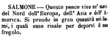 | Salmone - Questo pesce vive nè mari del Nord dell'Europa, dell'Asia e dell'America. Si prende in gran quantità nei fiumi, i quali esso risale per deporvi il suo fregolo. [immagine] |