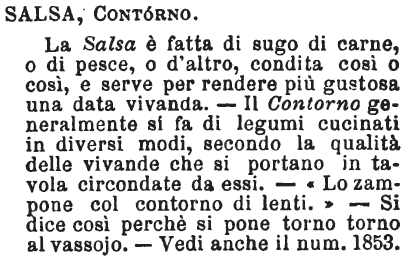 | Salsa, Contorno - La Salsa è fatta di sugo di carne, o di pesce, o d'altro, condita così o così, e serve per rendere più gustosa una data vivanda. - Il Contorno generalmente si fa di legumi cucinati in diversi modi, secondo la qualità delle vivande che si portano in tavola circondate da essi. - «Lo zampone col contorno di lenti.» - Si dice così perchè si pone torno torno al vassojo. - Vedi anche il num. 1853. [immagine] |