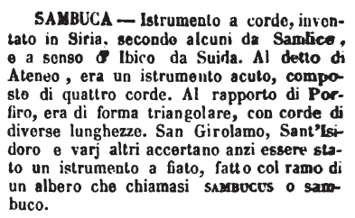 | Sambuca - Istrumento a corde, inventato in Siria, secondo alcuni da Samlice, e a senso d'Ibico da Suida. Al detto di Ateneo, era un istrumento acuto, composto di quattro corde. Al rapporto di Porfiro, era di forma triangolare, con corde di diverse lunghezze. San Girolamo, Sant'Isidoro e varj altri accertarono anzi essere stato un istrumento a fiato, fatto col ramo di un albero che chiamasi sambucus o sambuco. [immagine] |