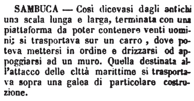 Sambuca - Macchina da guerra per l'assedio delle Piazze o Fortezze, che venivano attaccate dalla parte di Mare. Consisteva quella in una scala della larghezza di quattro piedi, la quale allorquando si alzava era elevata quanto le Mura. Si teneva distesa su i lati o fianchi di due Galere unite insieme, in tal modo che oltrepassava assai gli Sproni o prue, ed in cima agli alberi di queste stesse galere vi si adattavano carrucole e corde. Quando si voleva servirsene per la scalata si attaccavano le corde alla estremità della macchina, e nel mentre che s'innalzava dalla parte di poppa, altri sulla prua ajutavano pure ad alzarla in forza di leve. Quindi le galere essendo spinte verso le mura, vi s'accostavano queste macchine, e con tal mezzo gli assedianti salivano e passavano sulle mura dell'inimico.