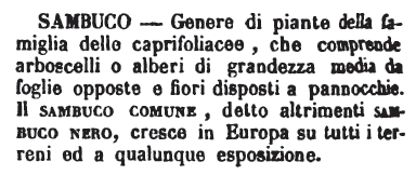 | Sambuco - Genere di piante della famiglia delle caprifoliacee, che comprende arboscelli o alberi di grandezza media da foglie opposte e fiori disposti a pannocchie. il sambuco comune, detto altrimenti sambuco nero, cresce in Europa su tutti i terreni ed a qualunque esposizione. [immagine] |