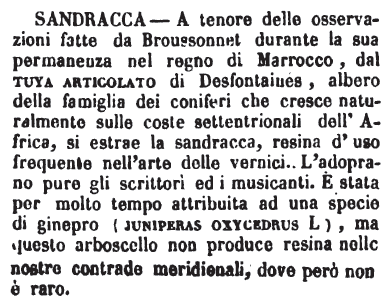 | Sandracca - A tenore delle osservazioni fatte da Broussonnet durante la sua permanenza nel regno di Marrocco, dal tuya articolato di Desfontaines, albero della famiglia dei coniferi che cresce naturalmente sulle coste settentrionali dell'Africa, si estrae la sandracca, resina d'uso frequente nell'arte delle vernici. L'adoprano pure gli scrittori ed i musicanti. E' stata per molto tempo attribuita ad una specie di ginepro (juniperas oxycedrus L), ma questo arboscello non produce resina nelle nostre contrade meridionali, dove però non è raro. [immagine] |