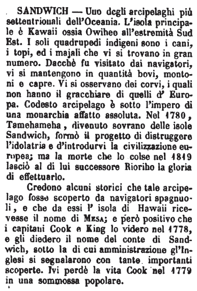 | Sandwich - Uno degli arcipelaghi più settentrionali dell'Oceania. L'isola principale è Kawaii ossia Owihee all'estremità Sud Est. I soli quadrupedi indigeni sono i cani, i topi, ed il majali che vi si trovano in gran numero. Dacchè fu visitato dai navigatori, vi si mantengono in quantità bovi, montoni e capre. Vi si osservano dei corvi, i quali non hanno il gracchiare di quelli d'Europa. Codesto arcipelago è sotto l'impero di una monarchia affatto assoluta. Nel 1780, Tamehameha, divenuto sovrano delle isole Sandwich, formò il progetto di distruggere l'idolatria e d'introdurvi la civilizzazione europea; ma la morte che lo colse nel 1819 lasciò al di lui successore Rioriho la gloria di effettuarlo.