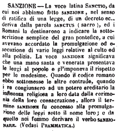Sanzione - S. f. Ratificazione, Confermazione. Term. de' Legisti, i quali per lo più chiamano Sanzione Quella parte della legge che contiene la minaccia della pena ai trasgressori, o la promessa di ricompensa agli osservatori di essa legge, ovvero il bene o il male che conseguono (per effetto della legge) dalla osservanza, o trasgressione della medesima. Magal. Lett. At. 616. (M.) Circa il venire, o il non venire la legge mosaica da Dio…, o ella si consideri nella sua origine, o si consideri nelle sue sanzioni tutte conformi ai dettami della ragione… veniva a essere… T. Sanzione soprannaturale di legge umana.