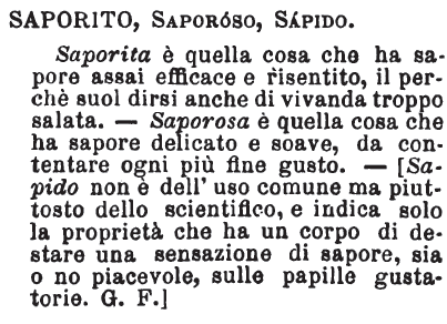 | Saporito, Saporoso, Sapido - Saporita è quella cosa che ha sapore assai efficace e risentito, il perchè suol dirsi anche di vivanda troppo salata. - Saporosa è quella cosa che ha sapore delicato e soave, da contentare ogni più fine gusto. - [Sapido non è dell'uso comune ma piuttosto dello scientifico, e indica solo la proprietà che ha un corpo di destare una sensazione di sapore, sia o no piacevole, sulle papille gustatorie. G. F.] [immagine] |