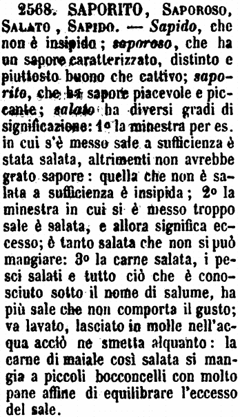 | Saporito, Saporoso, Salato, Sapido - Sapido, che non è insipido; saporoso, che ha un sapore caratterizzato, distinto e piuttosto buono che cattivo; saporito, che ha sapore piacevole e piccante; salato ha diversi gradi di significazione: 1° la minestra per es. in cui s'è messo sale a sufficienza è stata salata, altrimenti non avrebbe grato sapore: quella che non è salata a sufficienza è insipida; 2° la minestra in cui si è messo troppo sale è salata, e allora significa eccesso; è tanto salata che non si può mangiare: 3° la carne salata, i pesci salati e tutto ciò che è conosciuto sotto il nome di salume, ha più sale che non comporta il gusto; va lavato, lasciato in molle nell'acqua acciò ne smetta alquanto: la carne di maiale così salata si mangia a piccoli bocconcelli con molto pane affine di equilibrare l'eccesso del sale. [immagine] |