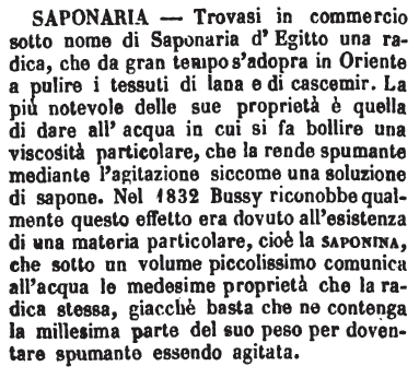 | Saponaria - Trovasi in commercio sotto nome di Saponaria d'Egitto una radica, che da gran tempo s'adopra in Oriente a pulire i tessuti di lana e di cascemir. La più notevole delle sue proprietà è quella di dare all'acqua in cui si fa bollire una viscosità particolare, che la rende spumante mediante l'agitazione siccome una soluzione di sapone. Nel 1832 Bussy riconobbe qualmente questo effetto era dovuto all'esistenza di una materia particolare, cioè la saponina, che sotto un volume piccolissimo comunica all'acqua le medesima proprietà che la radica stessa, giacchè basta che ne contenga la millesima parte del suo peso per doventare spumante essendo agitata. [immagine] |