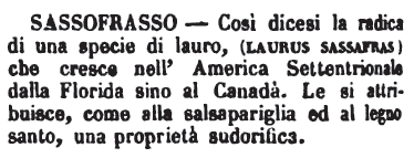 | Sassofrasso - Cosi dicesi la radica di una specie di lauro, (laurus sassafras) che cresce nell'America Settentrionale dalla Florida sino al Canadà. Le si attribuisce, come alla salsapariglia ed al legno santo, una proprietà sudorifica. [immagine] |