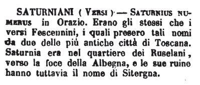 | Saturniani (versi) - Saturnius numerus in Orazio. Erano gli stessi che i versi Fescennini, i quali presero tali nomi da due delle più antiche città di Toscana. Saturnia era nel quartiere dei Ruselani, verso la foce della Albegna, e le sue ruine hanno tuttavia il nome di Sitergna. [immagine] |