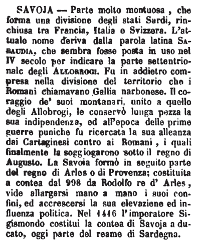 | Savoja - Parte molto montuosa, che forma una divisione degli stati Sardi, rinchiusa tra Francia, Italia e Svizzera. L'attuale nome deriva dalla parola latina Sabaudia, che sembra fosse posta in uso nel IV secolo per indicare la parte settentrionale degli Allorrogi. Fu in addietro compresa nella divisione del territorio che i Romani chiamavano Gallia narbonese. Il coraggio de' suoi montanari, unito a quello degli Allobrogi, le conservò lunga pezza la sua indipendenza, ed all'epoca delle prime guerre puniche fu ricercata la sua alleanza dai Cartaginesi contro ai Romani, i quali finalmente la soggiogarono sotto il regno di Augusto. La Savoia formò in seguito parte del regno di Arles o di Provenza; costituita a contea dal 998 da Rodolfo re d'Arles, vide allargarsi mano a mano i suoi confini, ed accrescersi la sua elevaziene ed influenza politica. Nel 1416 l'imperatore Sigismondo costituì la contea di Savoja a ducato, oggi parte del reame di Sardegna. [immagine] |