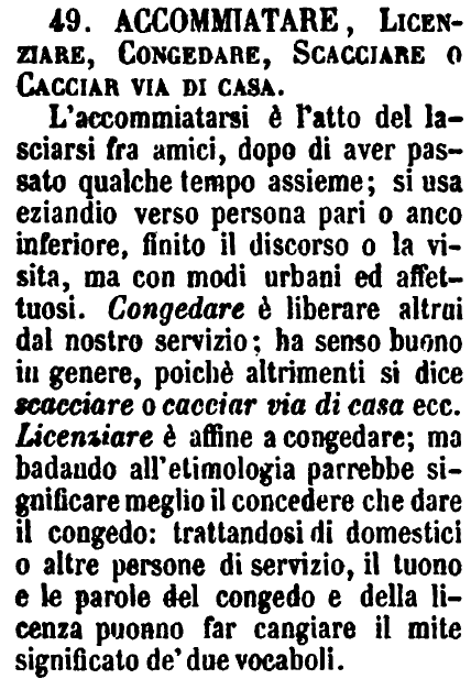 | Accommiatare, Licenziare, Congedare, Scacciare o Cacciar via di casa - L'accomiatarsi è l'atto del lasciarsi fra amici, dopo di aver passato qualche tempo assieme; si usa eziandio verso persona pari o anco inferiore, finito il discorso o la visita, ma con modi urbani ed affettuosi. Congedare è liberare altrui dal nostro servizio; ha senso buono in genere, poichè altrimenti si dice scacciare o cacciar via di casa ecc. Licenziare è affine a congedare; ma badando all'etimologia parrebbe significare meglio il concedere che dare il congedo: trattandosi di domestici o altre persone di servizio, il tuono e le parole del congedo e della licenza puonno far cangiare il mite significato de' due vocaboli. [immagine] |