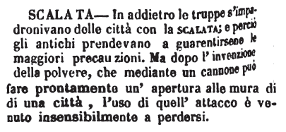 | Scalata - In addietro le truppe s'impadronivano delle città con la scalata; e perciò gli antichi prendevano a guarentirsene le maggiori precauzioni. Ma dopo l'invenzione della polvere, che mediante un cannone può fare prontamente un'apertura alle mura di una città, l'uso di quell'attacco è venuto insensibilmente a perdersi. [immagine] |
