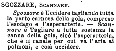 | Sgozzare, Scannare - Sgozzare è Uccidere tagliando tutta la parte carnosa della gola, compreso l'esofago e l'asperarteria. - Scannare è Tagliare a tutta sostanza la canna della gola, cioè l'asperarteria, che è il canale per cui va l'aria ai polmoni, e così uccidere. [immagine] |