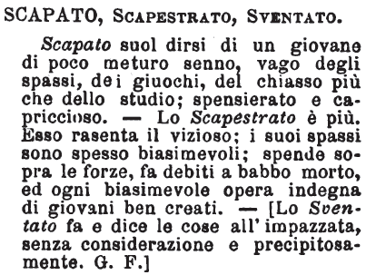 | Scapato, Scapestrato, Sventato - Scapato suol dirsi di un giovane di poco meturo senno, vago degli spassi, dei giuochi, del chiasso più che dello studio; spensierato e capriccioso. - Lo Scapestrato è più. Esso rasenta il vizioso; i suoi spassi sono spesso biasimevoli; spende sopra le forze, fa debiti a babbo morto, ed ogni biasimevole opera indegna di giovani ben creati. - [Lo Sventato fa e dice le cose all'impazzata, senza considerazione e precipitosamente. G. F.] [immagine] |