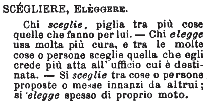 | Scegliere, Eleggere - Chi sceglie, piglia tra più cose quelle che fanno per lui. - Chi elegge usa molta più cura, e tra le molte cose o persone sceglie quella che egli crede più atta all'ufficio cui è destinata. - Si sceglie tra cose o persone proposte o messe innanzi da altrui; si elegge spesso di proprio moto. [immagine] |
