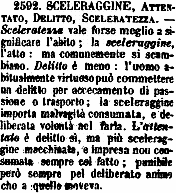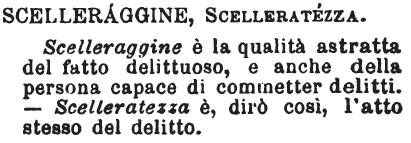 | Scelleraggine, Scelleratezza - Scelleraggine è la qualità astratta del fatto delittuoso, e anche della persona capace di commetter delitti. - Scelleratezza è, dirò così, l'atto stesso del delitto. [immagine] |